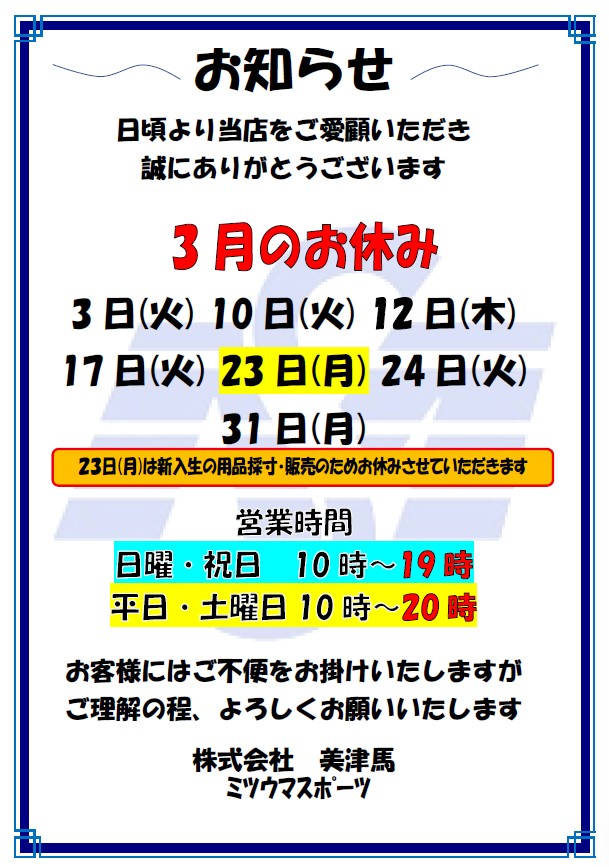 3月定休日のお知らせ