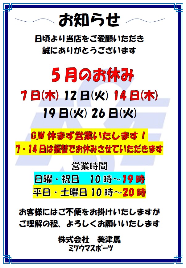 5月お休みのお知らせ
